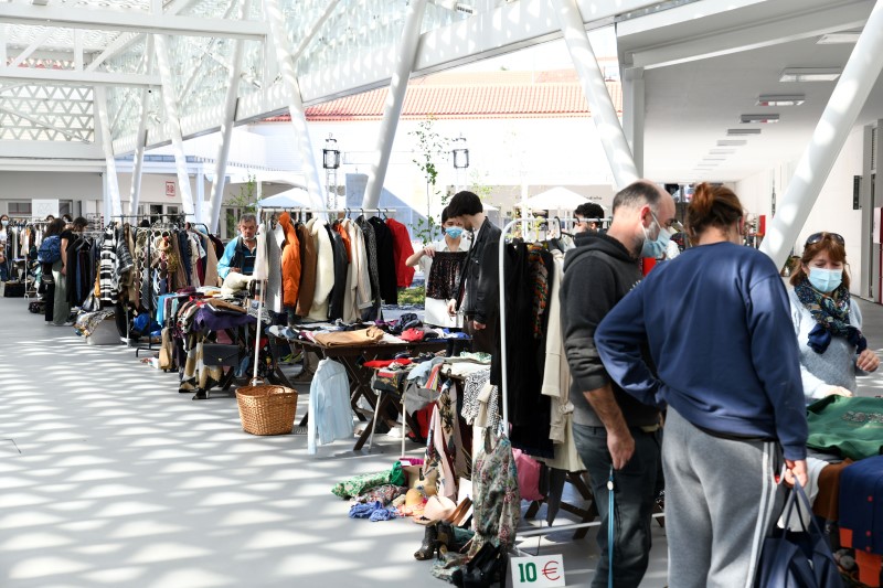 Roupa, calçado e acessórios de moda são os artigos que a maioria dos vendedores traz a esta feira, uma iniciativa que se enquadra na promoção do conceito de economia circular, visando a redução do desperdício têxtil.